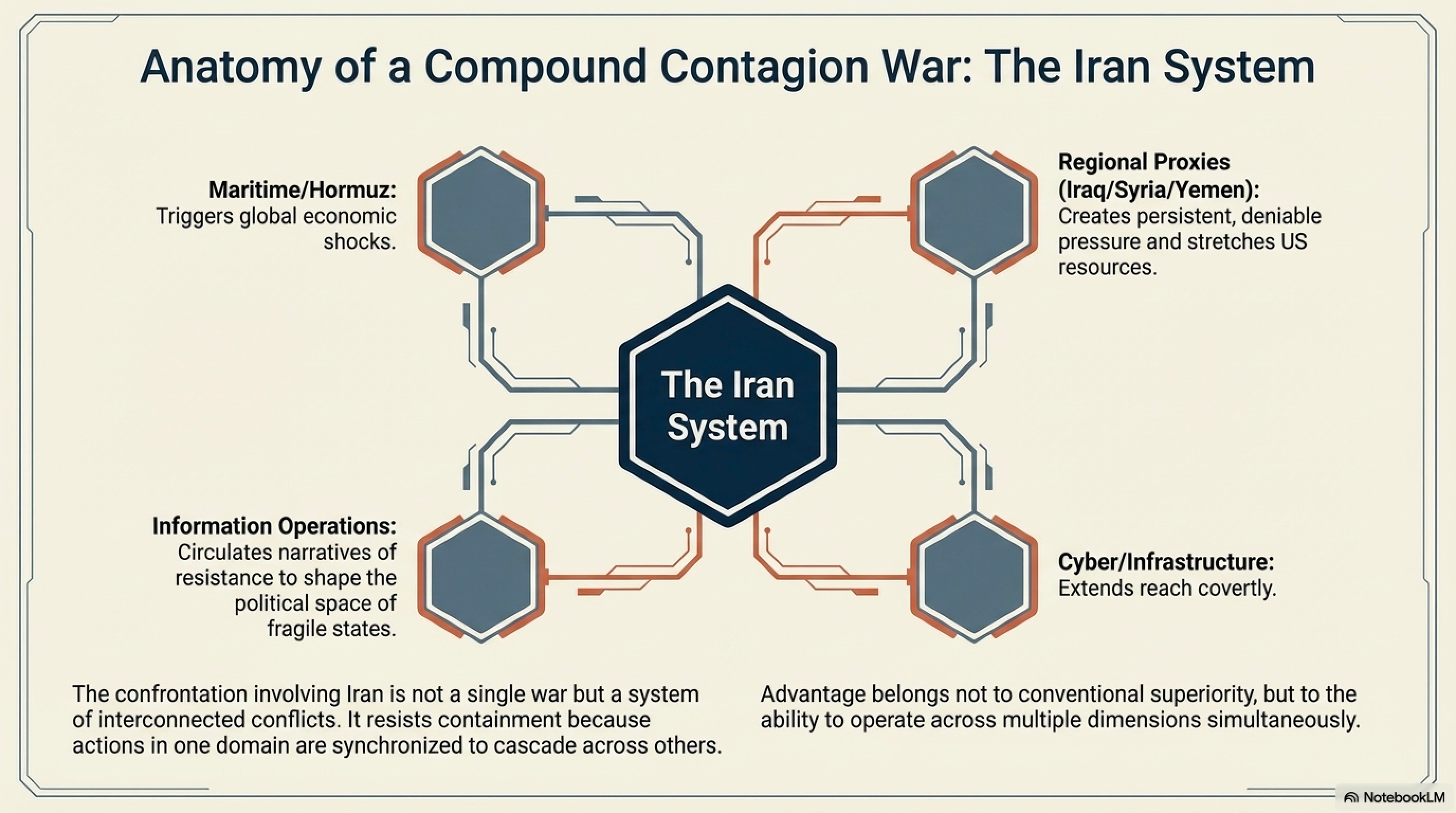 If Ukraine illustrates the dynamics of compound conflict in a largely conventional setting, Iran represents its most fully developed form in a transregional context. The confrontation involving Iran is not a single war but a system of interconnected conflicts, spanning multiple regions and domains.