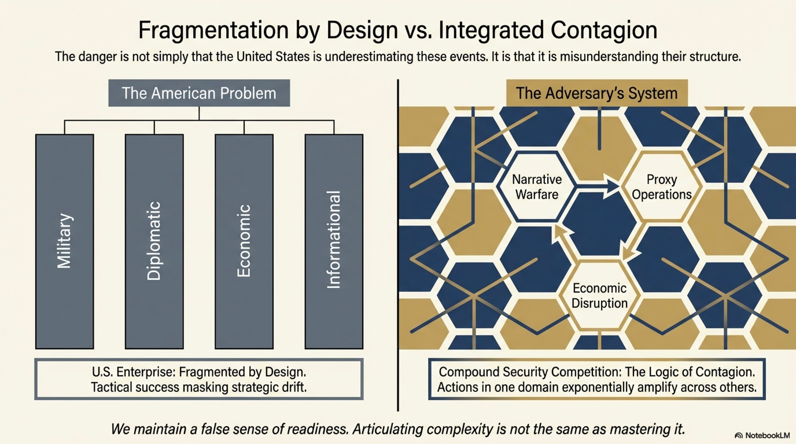 The result is a form of compound contagion war—a condition in which localized actions generate cascading regional and global effects. Traditional approaches, focused on discrete threats or theaters, are ill-suited to address such a system.