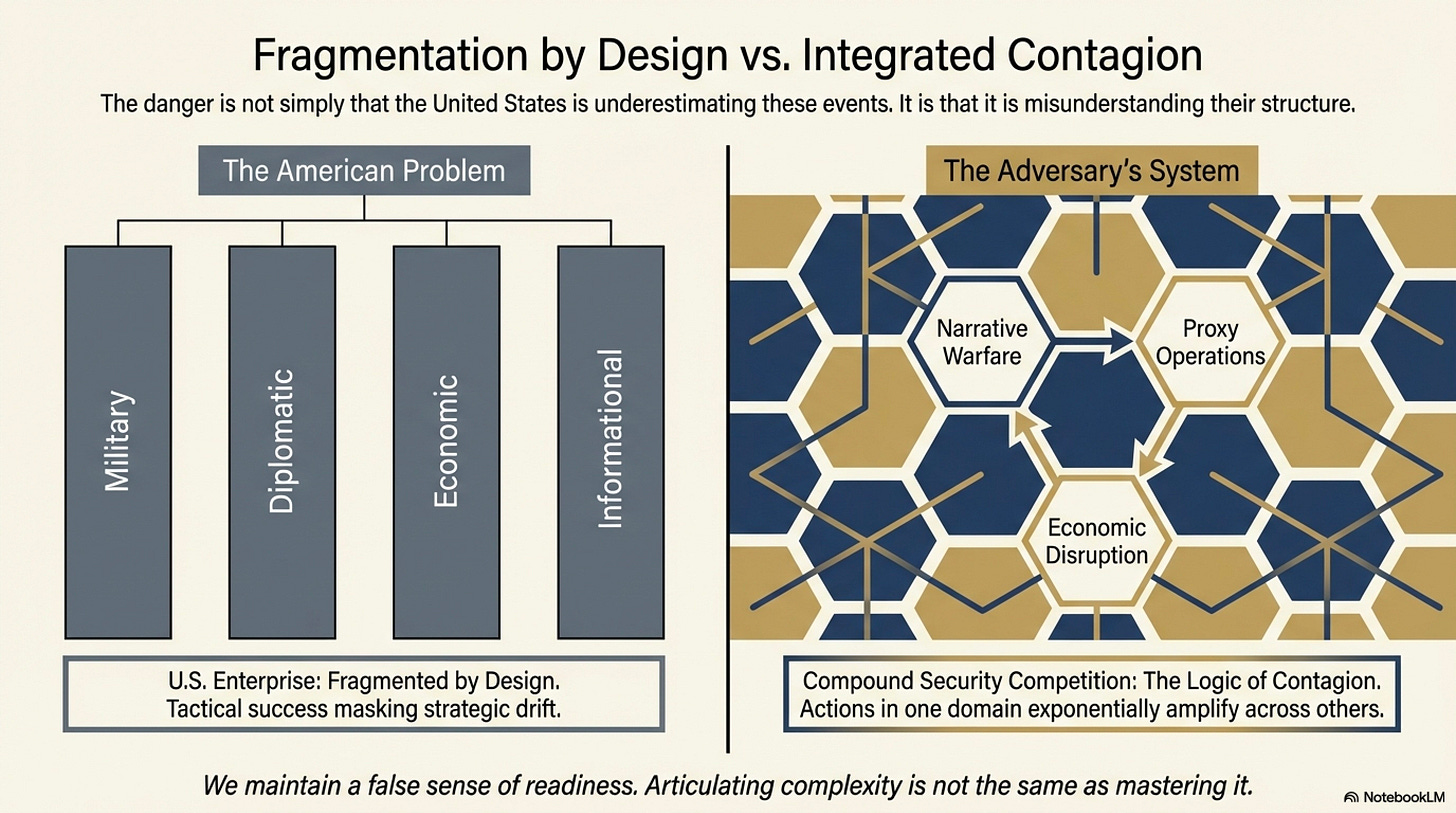 This fragmentation has profound consequences. It produces gaps in planning, delays in response, and inconsistencies in execution. More importantly, it creates the very seams that adversaries exploit. As the experience of the past two decades has shown, the United States can achieve tactical success while falling short of strategic objectives—a paradox rooted in the disjunction between how it fights and how it organizes.⁸