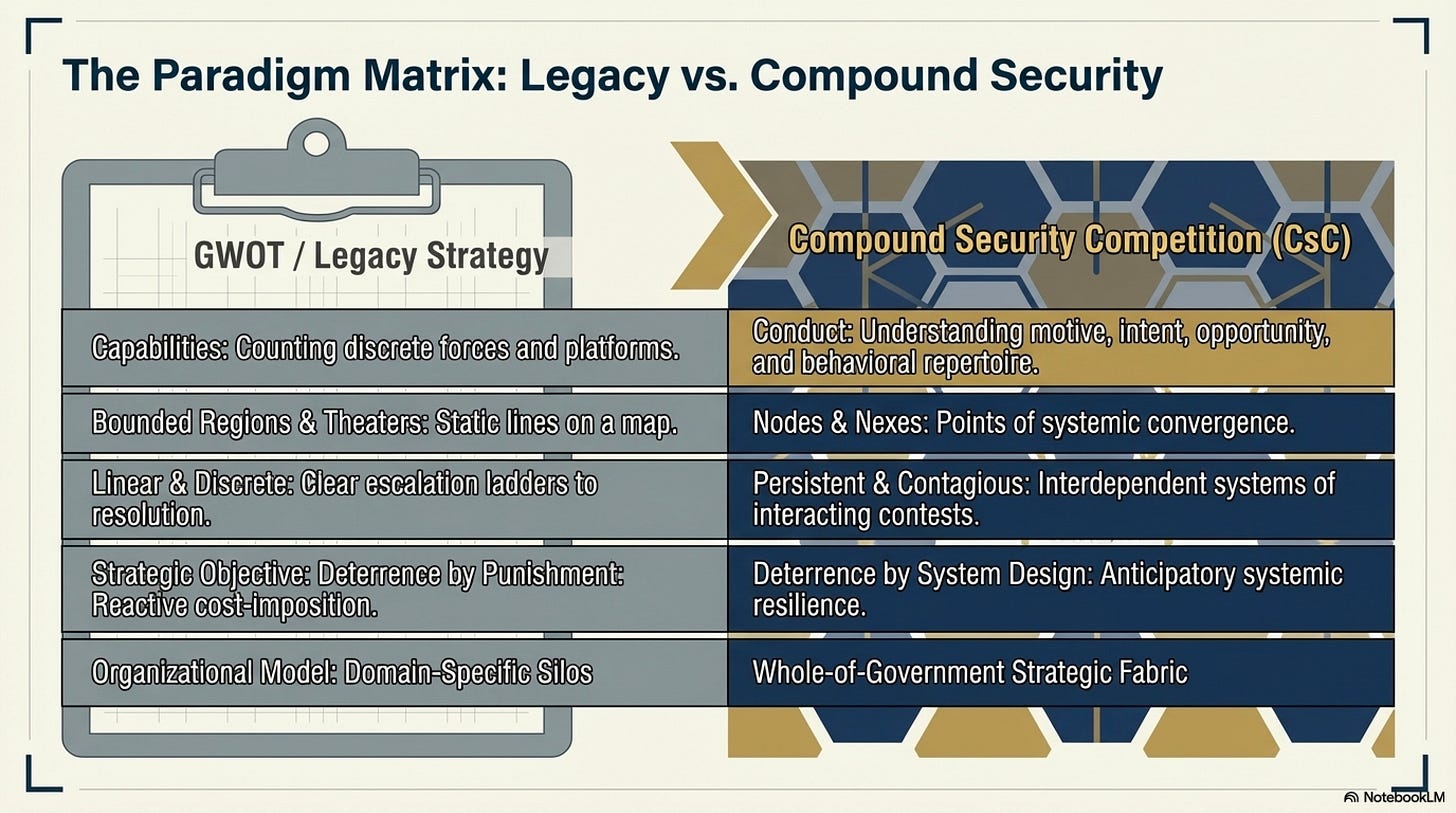 That condition is compound security competition: a form of strategic interaction in which adversaries apply synchronized pressure across military, economic, informational, and political domains, producing effects that are not merely additive but convergent and contagious.