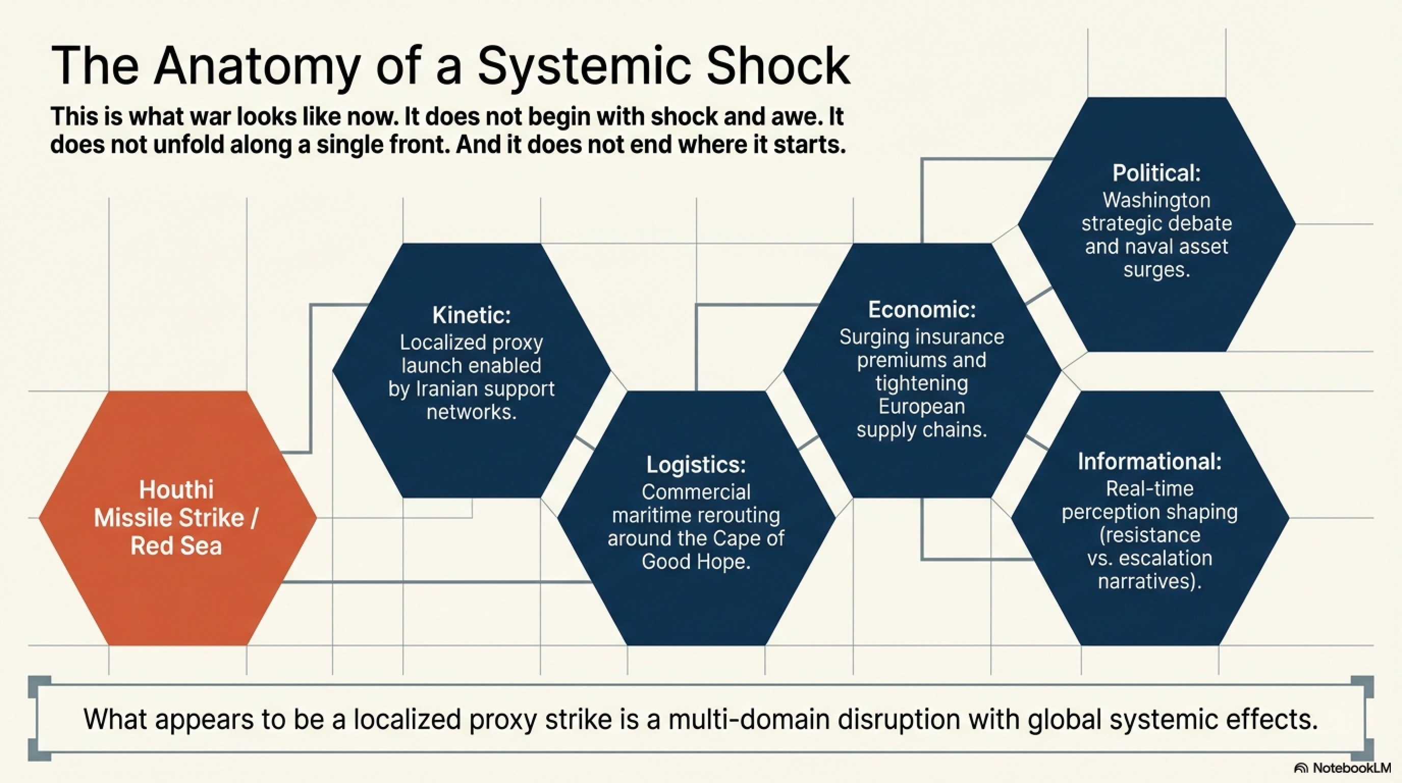 In the early hours of a recent morning, a cluster of commercial vessels slowed unexpectedly in the southern Red Sea. Insurance premiums had already surged. Satellite imagery showed unusual patterns of maritime rerouting. Within hours, a Houthi missile strike—launched from Yemen but enabled by Iranian support networks—forced another wave of global shipping to divert around the Cape of Good Hope. The immediate damage was limited. No fleets clashed. No formal declarations were issued.