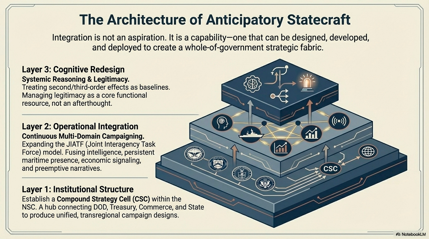 Building on this insight, the United States must move toward what might be described as a whole-of-government strategic fabric—an integrated architecture that aligns planning, operations, and analysis across domains and agencies. This requires reimagining not only structures, but processes.