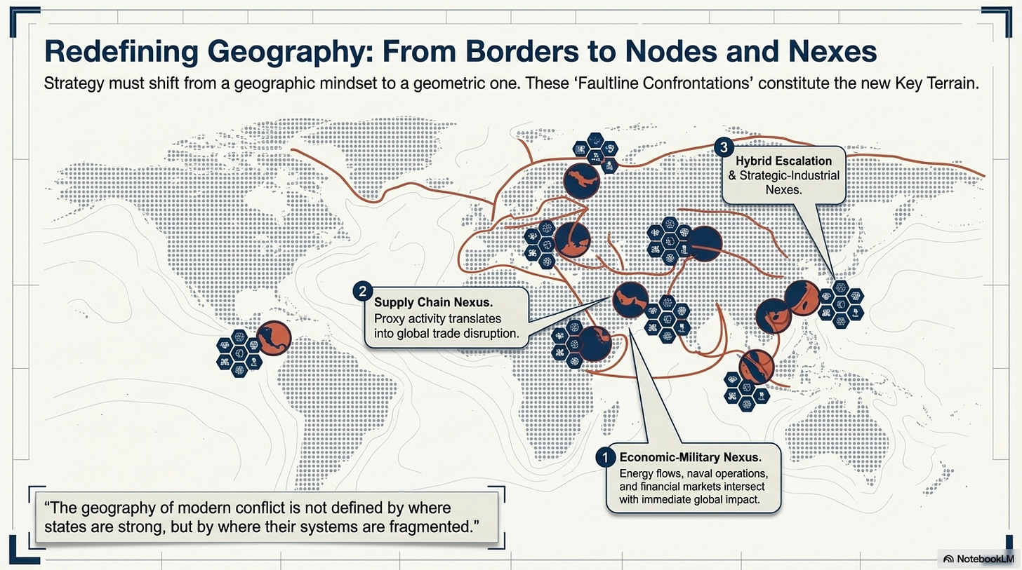To grasp how compound dynamics operate in practice, it is necessary to rethink the geography of conflict. Traditional strategic maps, organized around regions and theaters, fail to capture the reality of a world structured by intersections rather than boundaries. What matters are not simply locations, but points of convergence—what might be termed nodes and nexes.