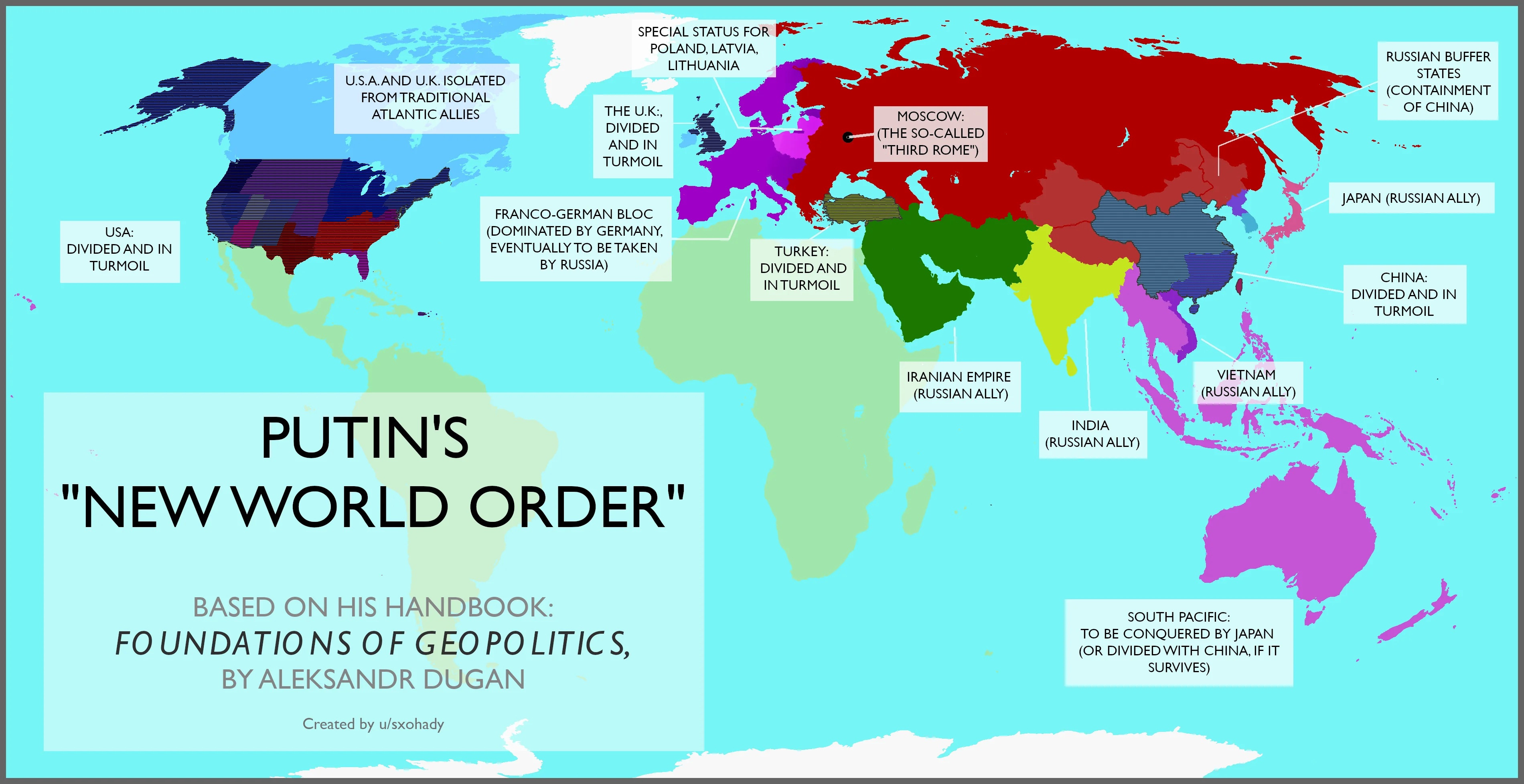 The map above—“Putin’s New World Order”—is not merely a cartographic curiosity. It is an ideological artifact. It is a visual manifestation of the Eurasianist vision articulated by Russian ultranationalist thinker Alexander Dugin in his geopolitical manifesto, Foundations of Geopolitics.